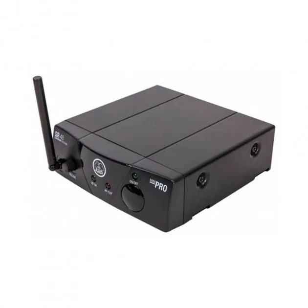 Приймач AKG SR40 Mini має три світлодіоди, що вказують на статус ВКЛ/ВИКЛ, сигнал (RF OK) і кліпінг (AF CLIP). Включений в комплект постачання блок живлення працює на будь-якій змінній напрузі від 110 до 240 В та включає адаптери ЄС, Великобританії, США. Час автономної роботи передавача – 30 годин від однієї батареї типу AA, як для моделей WMS 40, зменшує потребу у заміні батареї та дозволяє економити у довгостроковій перспективі.