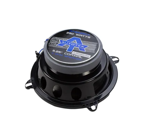 5,25-дюймовий двосмуговий динамік Autotek потужністю 250 Вт з твітером Neo Mylar з м'яким куполом та дифузорами Silver Alpha-Cellulose Poly.ВЧ-динаміки: 1 дюйм: високі чіткі частоти при великій потужності без різких звуків.Матеріал дифузора: сріблястий альфа-целюлозний полімер. Конуси: відтворюють м