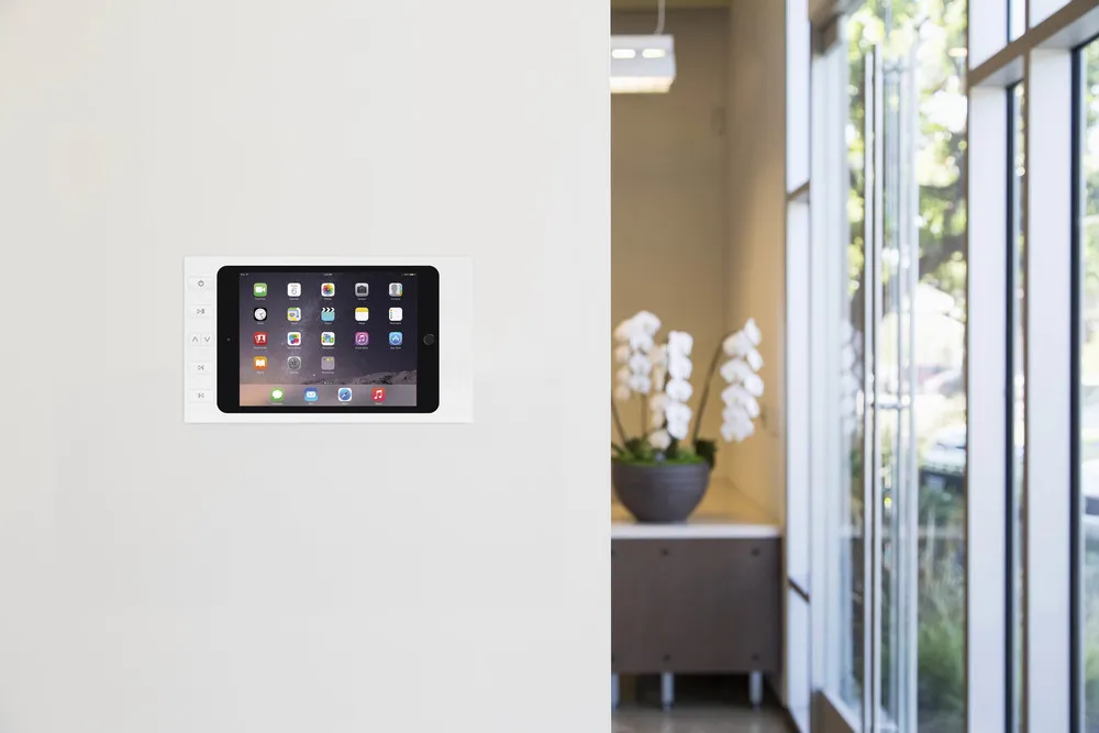 Настінна зарядна рамка Surface Mount для iPad mini 4 і iPad mini 5 c 6 кнопками для управління пристроями в Розумному будинку (AMX, Crestron, Control4, RTI, ELAN, URC, SAVANT і т.д.). Зроблена з алюмінію за допомогою високоточної лазерної обробки. Продумано отвори для динаміків і мікрофона, кнопки включення планшета. У даній комплектації пристрій заряджається за допомогою зарядки (Splitter POE), яка ховається за рамку.