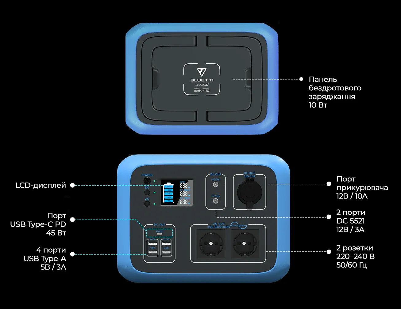 • Вихід постійного струму 12 В — регульований та дозволяє живити 12-вольтові прилади без зниження потужності.