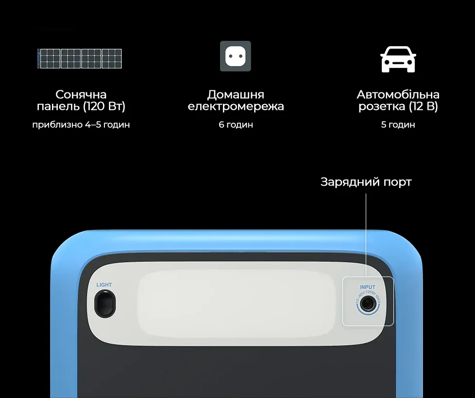 • Сонячна панель (не входить у комплект): близько 4-5 годин (120 Вт)