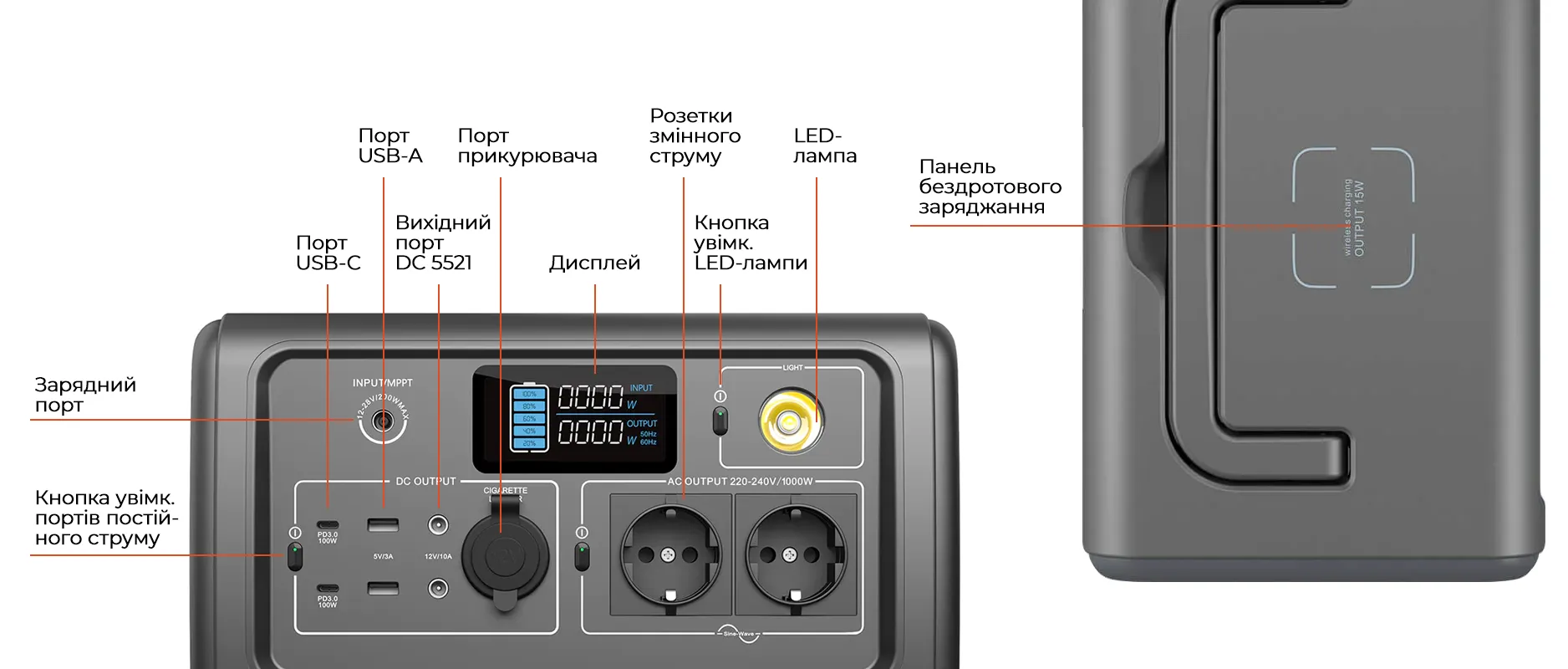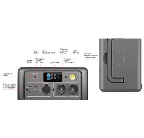 10 вихідних портів напевно задовольнять ваші потреби в одночасному заряджанні самих різних пристроїв. А 15-ватна панель бездротового заряджання на верхньому боці пристрою значно полегшить заряджання мобільного телефону. Електростанція забезпечить енергією все — від міні-холодильників до світлодіодних ліхтарів. Чудове компактне рішення для кемпінгу або якихось екстрених випадків!
