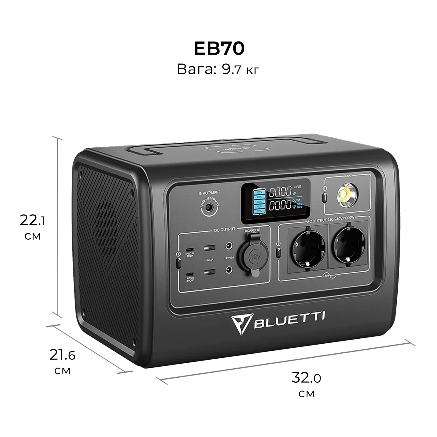 ХарактеристикиІнформація про акумулятор• Ємність: 716 Вт·год (22,4 В, 32 А·ч)• Тип: LiFePO4 (літій-залізо-фосфатний)• Життєві цикли: 2500+ циклів до 80% початкової ємності• Умови зберігання: заряджати до 80% кожні 3-6 місяців• Система управління: контролер MPPT, BMS та ін.Виходи• дві розетки змінного струму: 220-240 В, 1000 Вт• два порти USB-A: 5 В, 3 А• один автомобільний порт («прикурювач»): постійний струм 12 В, 10 А• два гнізда постійного струму DC 5521: 12 В, 10 А, 5,5 мм х 2,1 мм• два порти USB-C PD: 100 Вт• одна панель бездротового заряджання: 15 Вт• одна світлодіодна лампа: режими повної яскравості / половинної яскравості / SOS (блимаючий)Входи• Вхід адаптера змінного струму: макс. 200 Вт• Вхід для сонячної панелі: макс. 200 Вт, VOC 12-28 В, 8A• Вхід для автомобільної мережі: 12/24 В від порту прикурювачаЧас зарядки• Адаптер змінного струму (200 Вт): ≈4-4,5 години• одна сонячна панель Bluetti PV200 (200 Вт): повна зарядка від 0-100% за 5-6 годин• одна сонячна панель Bluetti PV120 (120 Вт): повна зарядка від 0-100% за 7-8 годин• Автомобільна розетка 12 В / 24 В (100 Вт / 200 Вт): ≈7,5-8 годин / 4-4,5 годинЗагальні характеристики• Вага: 9,7 кг• Габарити (ШхВхГ): 32 x 22,1 x 21,6 см• Робоча температура: від -10 до 40 ℃• Температура зберігання: від -10 до 45 ℃• Сертифікація: UKCA, CE, RCM, NTC, KC