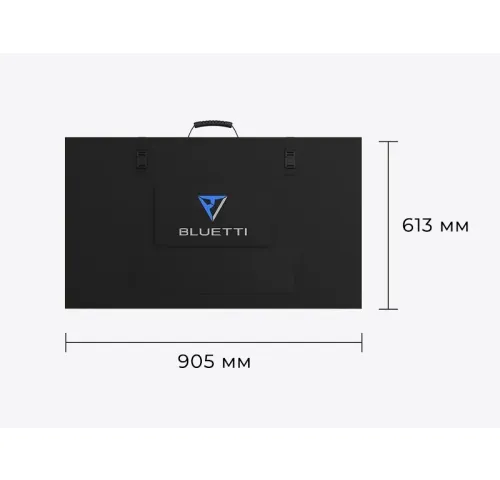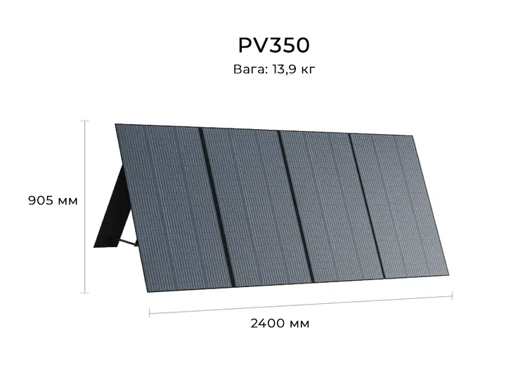 ОписАвтономне джерело живленняСонячна панель Bluetti PV350 виробляє відновлювану електроенергію із сонячної енергії. Вона є надійним та доступним джерелом живлення для вашого ноутбука, дрона, холодильника, електродриля та інших пристроїв. Причому, як удома, так і поза ним — у подорожі, у наметовому таборі, на пікніку чи на рибалці.Розкладна та портативнаРозміри сонячної панелі Bluetti PV350 у складеному вигляді лише 90 × 60 см, а важить вона трохи менше за 14 кг. Тому вона зручна у перенесенні. А ще вона настільки легко встановлюється та підключається, що з цим впорається кожен і у будь-якому місці.Міцна та вологозахищенаПоверхня панелі покрита довговічним етилен-тетрафторетиленовим пластиком (ETFE) з використанням найсучасніших технологій ламінування. Завдяки цьому Bluetti PV350 більш довговічна, має кращу світлопроникність, стійка до подряпин і легко чиститься навіть звичайною вологою тканиною. Панель захищена за стандартом IP65, що означає захист від бризок. (Але не залишайте панель під дощем і не допускайте її намокання!)Ефективність перетворення 23,4%Bluetti PV350 оснащена монокристалічною сонячною панеллю потужністю 350 Вт, що гарантує високу ефективність перетворення сонячної енергії на електричну — до 23,4%. Завдяки чудовій 95-відсотковій прозорості ця сонячна панель має більший ККД, ніж полікристалічні сонячні панелі, навіть в умовах низького освітлення. Панель забезпечена 4 опорами, що фіксуються, які дозволяють забезпечити пряме попадання сонячного світла для максимальної ефективності конверсії сонячного тепла в електричну енергію.Широка сумісністьСонячна панель Bluetti PV350, оснащена спеціальним роз'ємом MC4 та повністю сумісна з більшістю сонячних генераторів, представлених на ринку. Але особливо ефективно вона працюватиме з електростанціями від Bluetti — AC200P, AC200MAX, AC300, AC500, EP500, EP500PRO, EB240 та EB150.Головні особливості