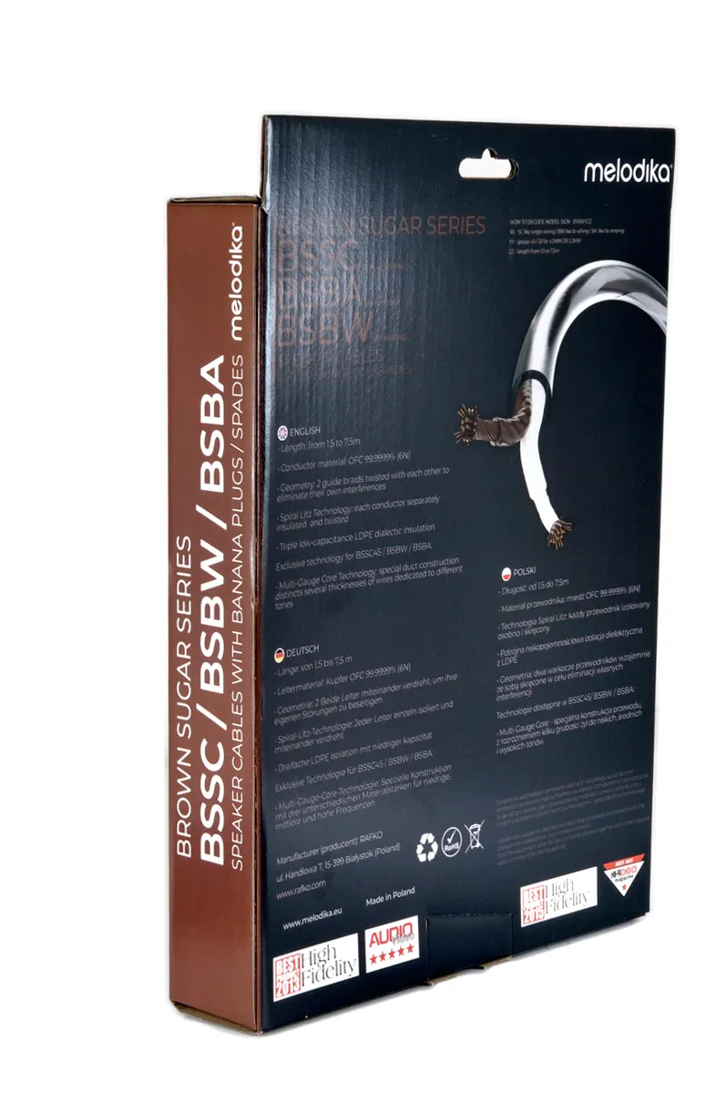 ОписMelodika BSSC4530 – високотехнологічний акустичний кабель класу Hi-End, довжина 3 мMelodika Brown Sugar BSSC4530 – це професійний акустичний кабель, створений для забезпечення максимально чистої та точної передачі звуку в системах високої вірності. Завдяки унікальному поєднанню технологій, таким як Spiral Litz, Multi-Gauge Core та Solid Grip, цей кабель не лише підсилює якість звучання, а й знижує втрати сигналу до мінімуму.У конструкції використано високочисту польську мідь класу OFC 6N (99,9999%), що гарантує відмінну провідність і тривалий термін експлуатації без втрати якості. Кожен провідник складається з кількох пучків жил різного діаметра, які ізольовані окремо та скручені у спіраль. Додаткова жила BassCore 0,85 мм² відповідає за глибоке, щільне відтворення басів. Така структура дозволяє практично повністю усунути шкірний ефект, забезпечуючи рівномірну передачу струму по всьому перерізу провідника.Кабель оснащений фірмовими банановими конекторами Solid Grip, які гідравлічно запресовуються на кабель, утворюючи монолітне з'єднання з мінімальним опором. Вони покриті 24-каратним золотом, що захищає контакт від окислення та гарантує стабільність підключення протягом усього терміну експлуатації.Прозора зовнішня ізоляція дозволяє візуально оцінити якість виконання та підкреслює естетику кабелю. Висока стійкість до механічних і електричних впливів робить його придатним навіть для монтажу під штукатуркою або в бетоні.Особливості:• Мідь OFC 6N (99,9999%) – надвисока чистота для максимальної провідності• Spiral Litz – кожна жила ізольована та скручена для усунення шкірного ефекту• Multi-Gauge Core – поєднання жил різного діаметра для точного відтворення всіх частот• BassCore 0,85 мм² – окрема жила для глибоких низьких частот• Технологія Solid Grip – гідравлічне пресування конекторів без паяння та гвинтів• Конектори з 24K золотим покриттям – запобігання окисленню, стабільне підключення• Трикратна ізоляція з LDPE – низька ємність і відмінна електроізоляція• Скручена структура провідників – зниження перешкод і зовнішніх наводок• Прозора оболонка – естетичний вигляд і контроль якості• Директивний кабель – рекомендований напрямок сигналу• Висока ізоляційна стійкість – підходить для прихованого монтажу• Виробництво – Польща• Сертифікація RoHS 2
