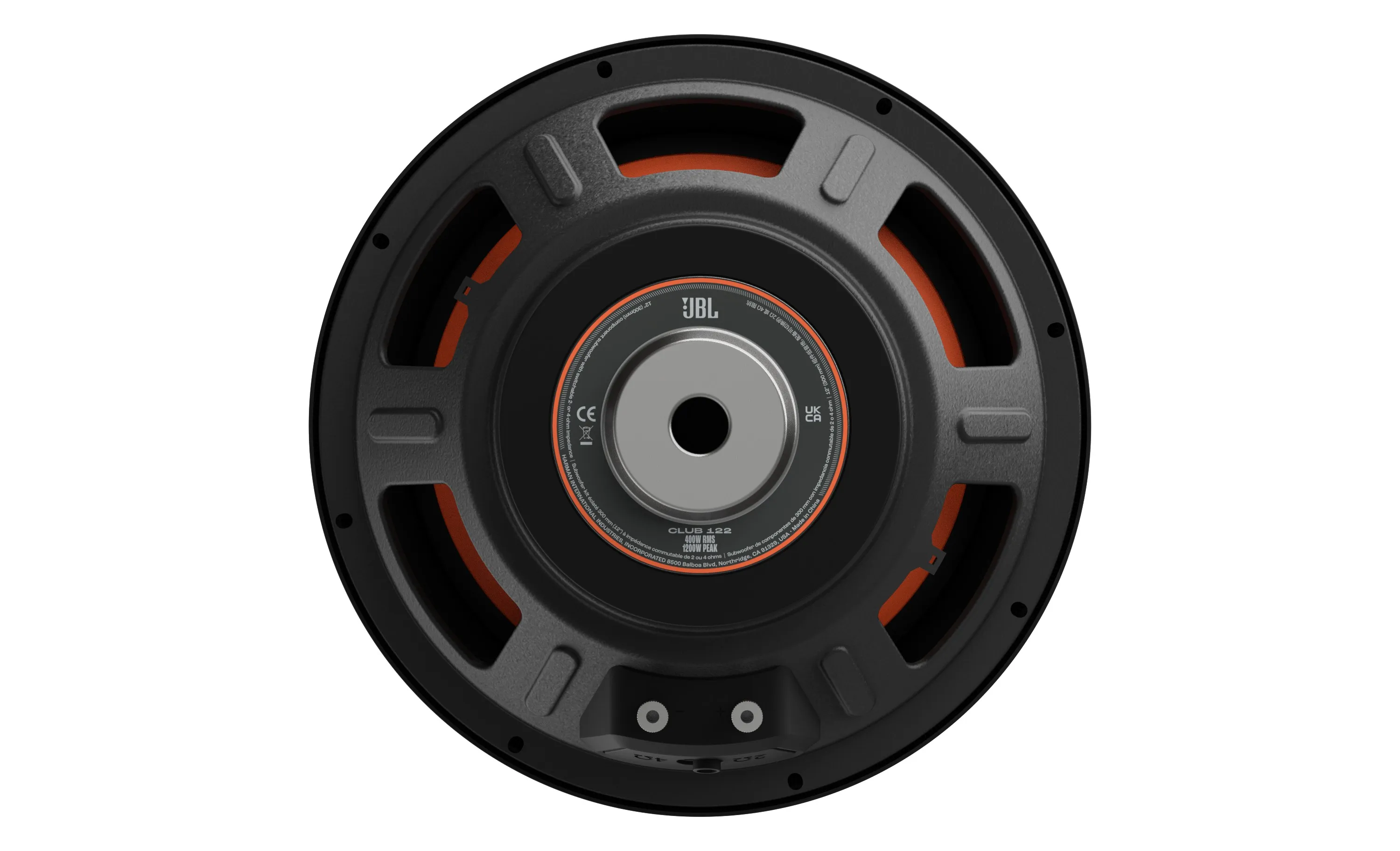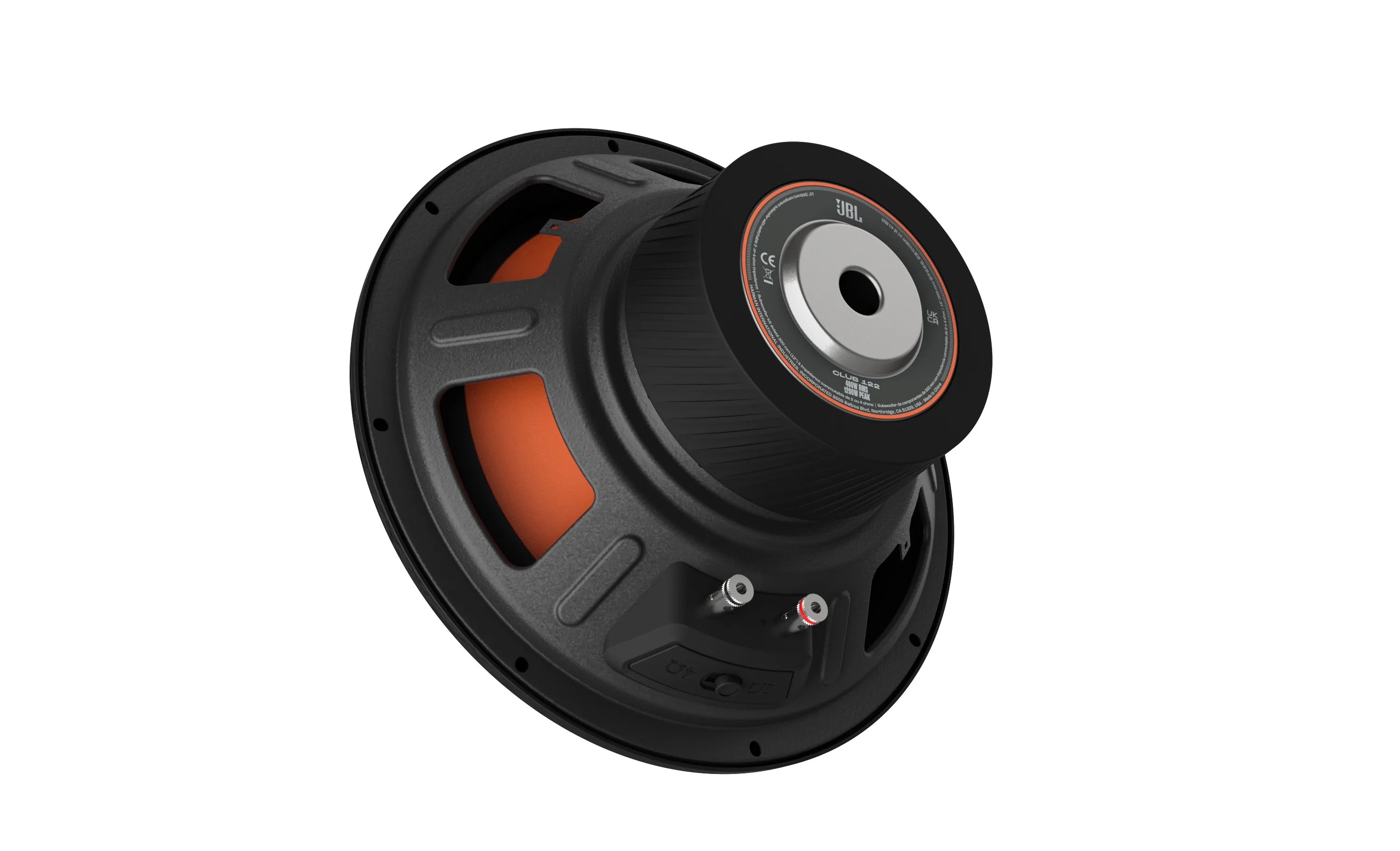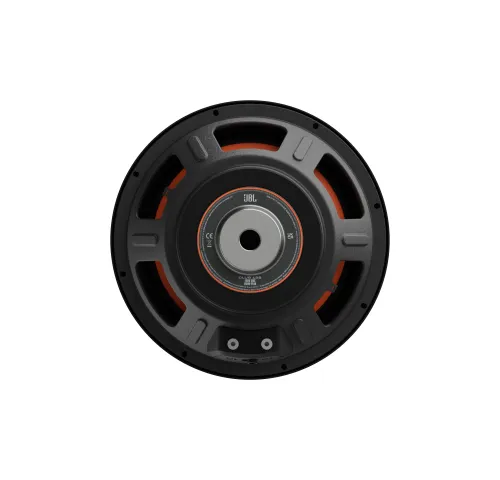 Стильний дизайн: Сабвуфер має великий інвертований пилозахисний ковпачок із фірмовим помаранчевим кольором JBL, що додає стильного вигляду аудіосистемі вашого автомобіля.