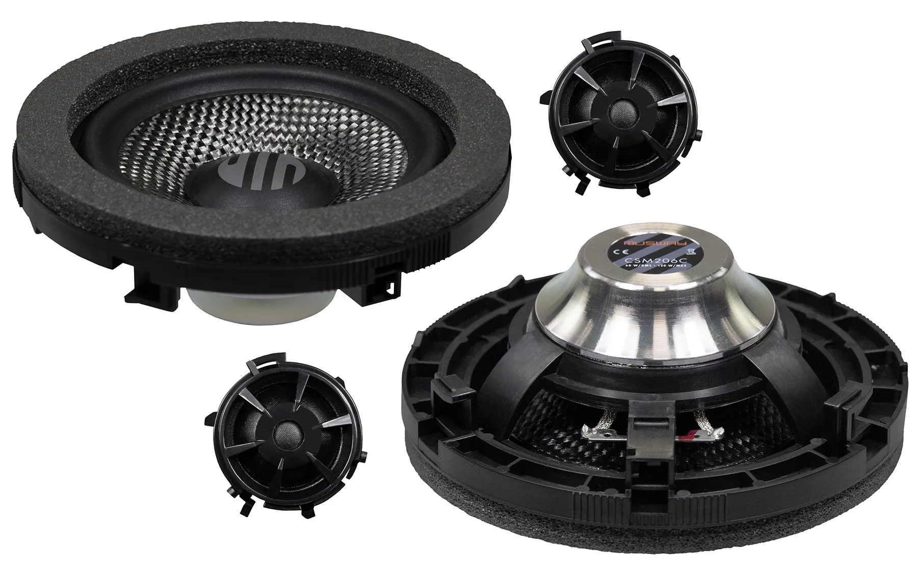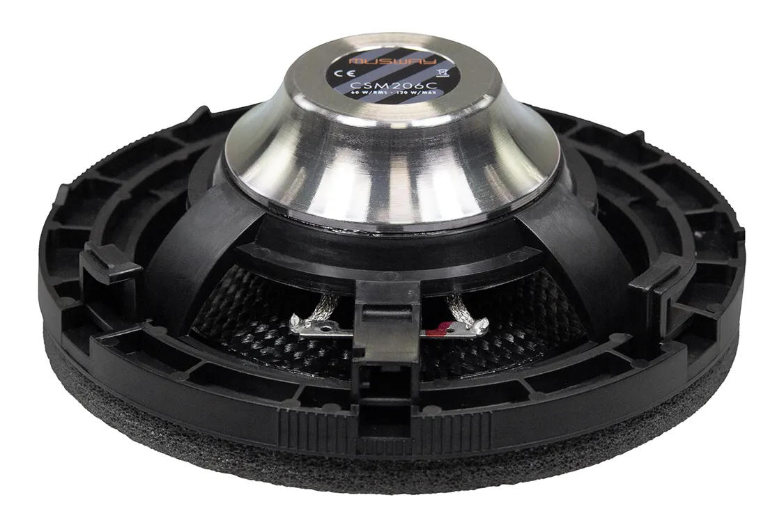 Для повноцінного звучання у всьому діапазоні Musway рекомендує встановлення окремих сабвуферів CSM206W у ніші під сидіннями водія та пасажира. Вони також побудовані на основі карбонових композитних мембран і подвійних неодимових магнітів, створюючи глибокий, щільний бас і забезпечуючи вражаюче акустичне занурення без необхідності у зовнішньому сабвуфері.