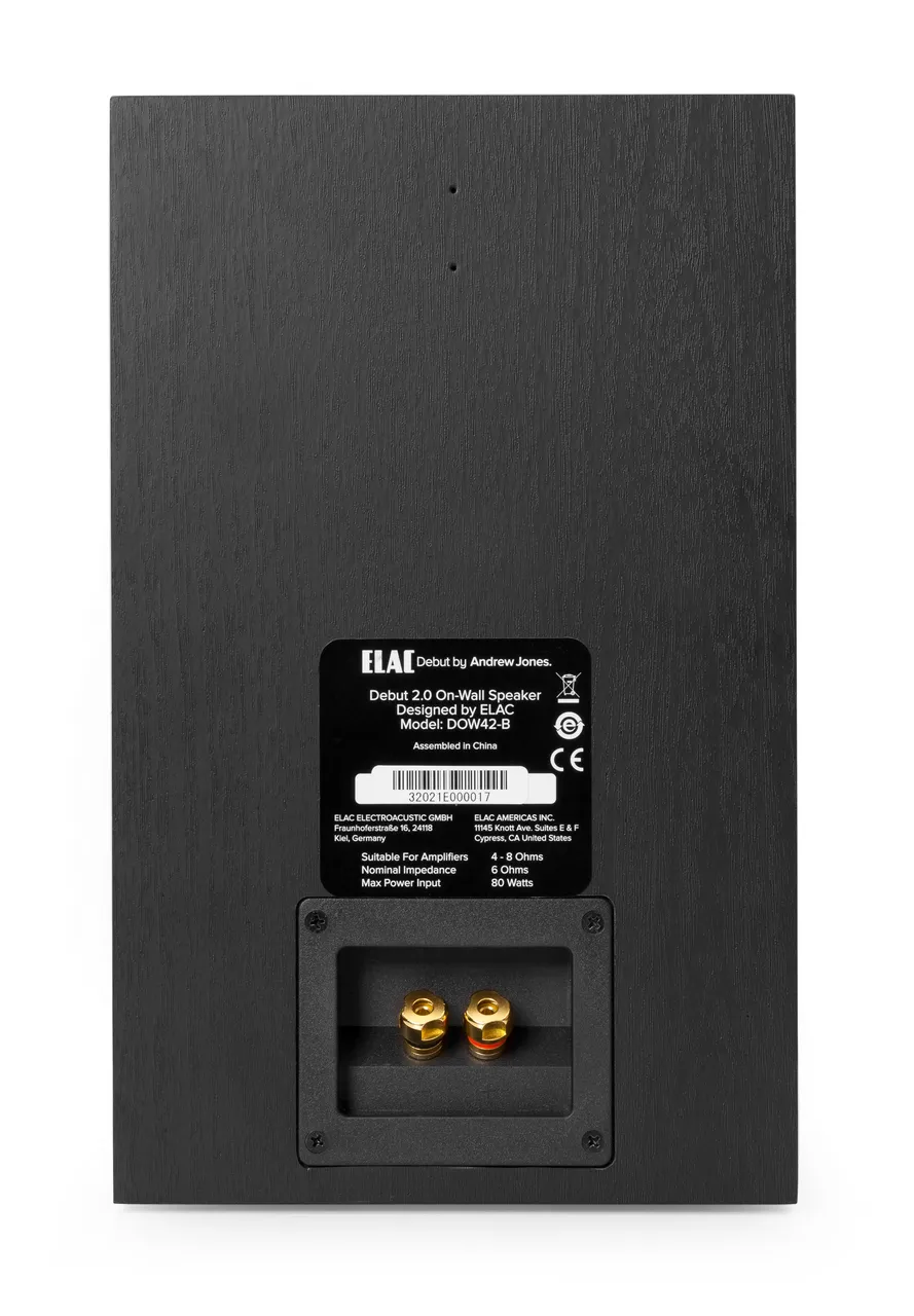 Корпус колонки виготовлено з товстого добірного MDF та оснащено внутрішнім демпфуванням для виключення спотворення звуку за високої гучності. Для обробки ELAC Debut OW4.2 використовується якісна вінілова плівка під натуральне дерево (чорний ясен). Колонка оснащена грилем, що знімається, але навіть якщо його зняти, твітер буде захищений власною круглою сіткою. Для підключення до підсилювача призначена пара гвинтових клем, які встановлені у спеціальній ніші для можливості щільного розміщення колонки до стіни.