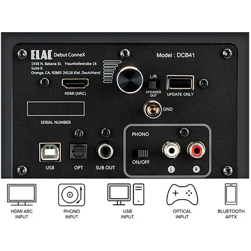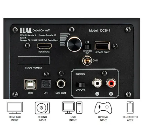 Дебют ELAC з активними моніторними динаміками ConneX DCB41Полочна акустика Debut ConneX DCB41 показує, наскільки просто можна забезпечити чудову якість звуку як для фільмів, так і для музики. Завдяки широкому вибору входів (HDMI ARC, аналоговий/фонокоректор, оптичний, USB та Bluetooth) та поєднанню
