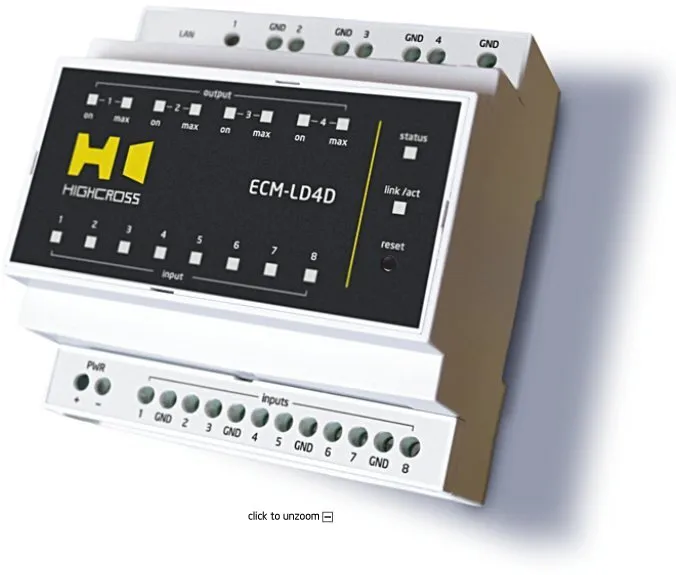 Світлодіодний модуль керування Highcross ECM-LD4D, призначений для підтримки перемикання та затемнення різних світлодіодних світильників. Одна модель підтримує навантаження до 30 В і 6 А. Крім того, ECM-LD4D має вісім цифрових входів, що дозволяють двоспрямоване затемнення світлодіодних навантажень із системою управління або без неї.
