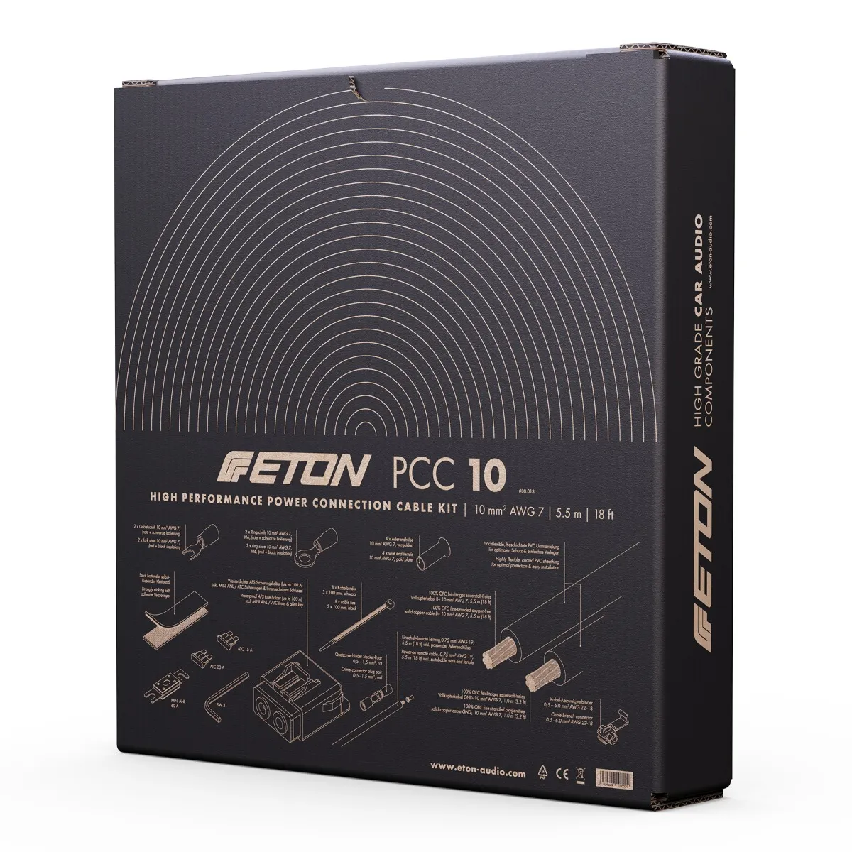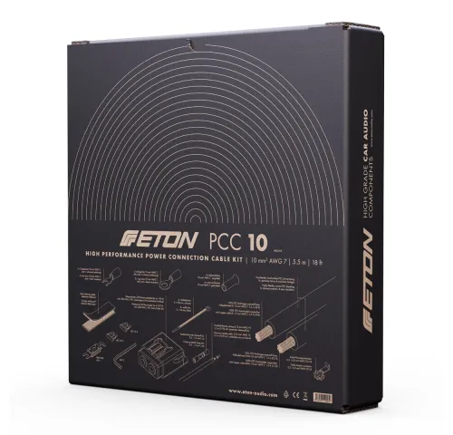 ETON PCC 10 – Високоякісний монтажний комплект живлення 10 мм² для автомобільної аудіоапаратуриETON PCC 10 — це професійний комплект силових кабелів преміумкласу, створений для легкого та надійного підключення автомобільних підсилювачів, активних сабвуферів або іншої потужної аудіоелектроніки. Завдя
