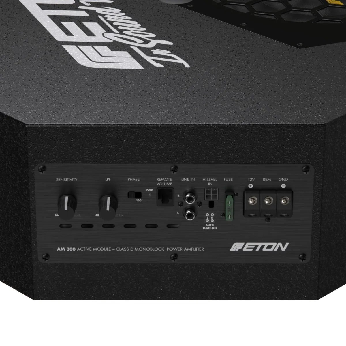 - Вбудований підсилювач AM300: забезпечує 300 Вт RMS потужності при 4 Ом, що гарантує потужний та чистий бас.