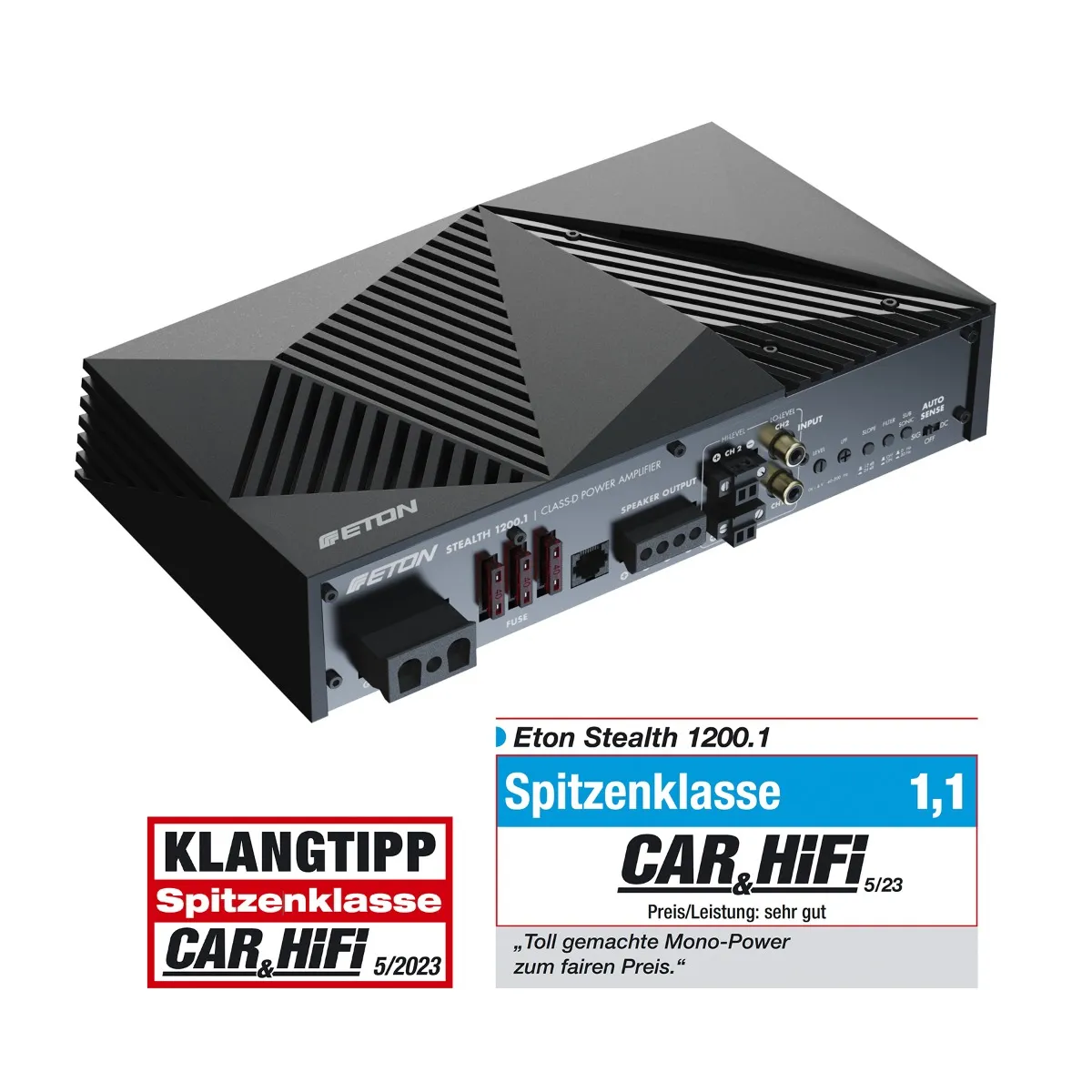 ОписEton Stealth 1200.1 - Моноблочний Підсилювач Нового ПоколінняВражаюча Потужність і Неперевершений КонтрольЗустрічайте Eton Stealth 1200.1 – новий член сімейства підсилювачів потужності STEALTH. Цей 1-канальний моноблочний підсилювач класу D вражає своєю потужністю і контролем. Відтворюйте глибокі та чисті баси з неймовірною потужністю 1200 Вт RMS на 1 Ом, 860 Вт RMS на 2 Ом, і 560 Вт на 4 Ом. Все це у витонченому та знайомому дизайні радіатора STEALTH.Технології Нового РівняEton Stealth 1200.1 оснащений знімними штекерами для живлення та аудіосигналу, що гарантує легке підключення і вищий рівень зручності. Високий коефіцієнт демпфування забезпечує винятковий контроль над звуком, а входи низького і високого рівня дозволяють гнучко підключати різноманітні аудіосистеми.Інтелектуальні Функції для Вашого КомфортуОснащений дозвуковим фільтром, фільтром низьких частот, та автоматичним виявленням увімкнення (DC & SIG), Eton Stealth 1200.1 ідеально підходить для сучасних транспортних засобів із функцією старт/стоп. Це робить його ідеальним вибором для любителів якісного звуку.Компактність та ЕлегантністьЗавдяки своїм мінімальним розмірам (ДхШхВ: 250 x 142 x 50 мм), цей підсилювач легко інтегрується в будь-яке середовище, зберігаючи при цьому елегантність та стиль.Розроблено в НімеччиніСтворений з німецькою точністю та увагою до деталей, Eton Stealth 1200.1 відображає кращі інженерні досягнення та інновації.