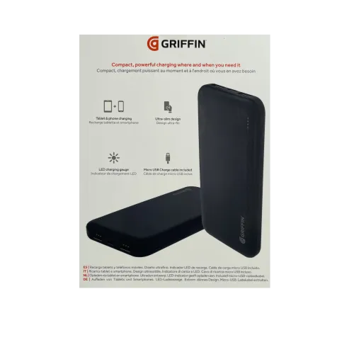 Бренд «Griffin» випускає свої продукти з 1992 року. Він спеціалізується на створенні сучасних якісних гаджетів із великим терміном служби.Griffin GP-147 — це зовнішній акумулятор (Powerbank), здатний зарядити ваш смартфон до трьох разів, а завдяки силі зарядки до 15 Вт зробити це ще й дуже швидко. П