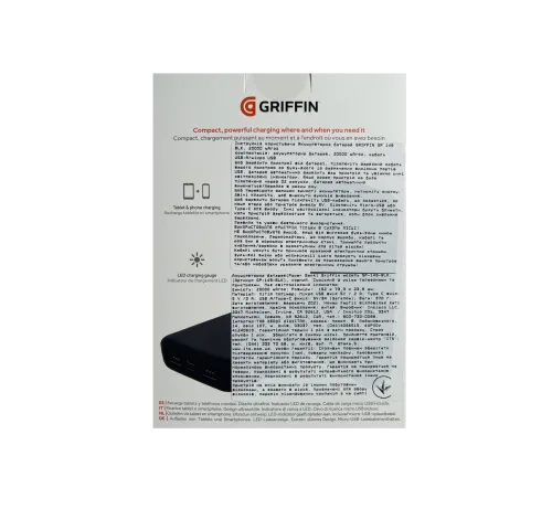 Бренд «Griffin» випускає свої продукти з 1992 року. Він спеціалізується на створенні сучасних якісних гаджетів із великим терміном служби.Griffin GP-149 — це зовнішній акумулятор (Powerbank), здатний зарядити ваш смартфон до трьох разів, а завдяки силі зарядки до 15 Вт зробити це ще й дуже швидко. П
