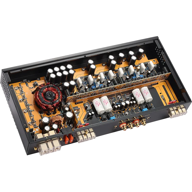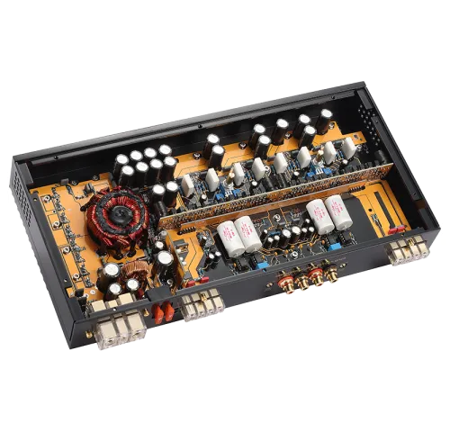 У конструкції використано високоякісні операційні підсилювачі OPA 2134 і аудіоконденсатори MUNDORF, що допомагає досягати акуратної сцени й низького рівня шумів у SQ-інсталяціях. М’яке затримане увімкнення по керуванню remote захищає систему від небажаних клацань, а позолочені роз’єми покращують надійність контактів. Масивний радіатор у виконанні під «рояльний лак» забезпечує ефективне відведення тепла та стабільну роботу під навантаженням.