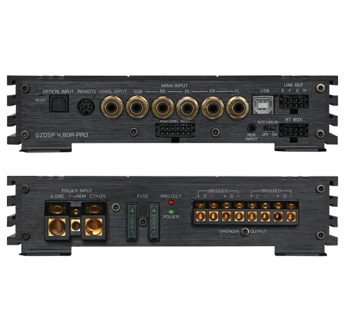 4-канальний підсилювач з вбудованим 8-канальним DSP, 6-канальним high-level входом / 5-канальним RCA, USB-входом, цифровим входом і AUX входами, а також функцією автоматичного включення.