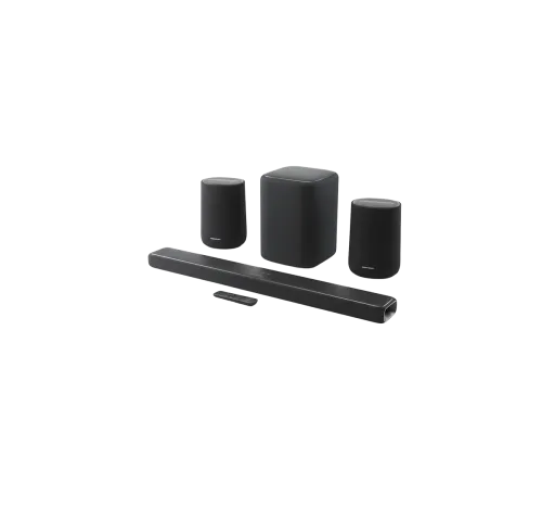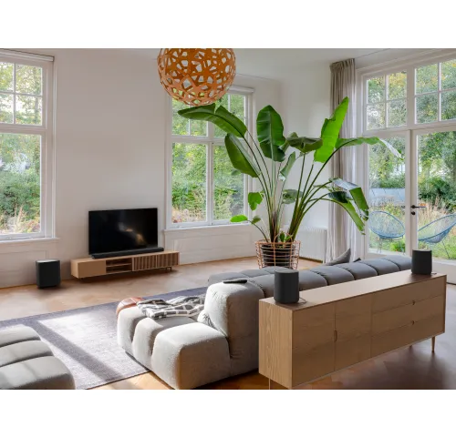 Сабвуфер Enchant Sub доповнює низькочастотний діапазон, створюючи потужні баси для глибшого ефекту присутності. А бездротові Enchant Speaker (дві колонки) працюють у синхроні з системою, забезпечуючи чисте та широке звучання з обох боків кімнати. Усі компоненти ідеально поєднані між собою, створюючи єдину просту у налаштуванні акустичну систему.