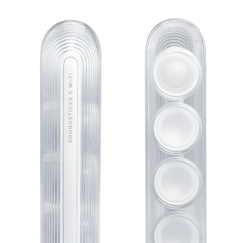 SoundSticks 5 Wi-Fi знову відкриває свою культову силуетну форму у світлому білому оздобленні, що додає будь-якому простору невимушеної елегантності. Повністю прозорий купол і прозорі сателітні колонки доповнені полірованими металевими деталями — для чистої, витонченої естетики, яка пасує сучасним інтер’єрам. У кожному елементі — простота: від лаконічного заднього блоку підключень до чутливих сенсорних кнопок на основі правої колонки. У результаті — преміальний досвід, що виглядає вишукано й відчувається легко.