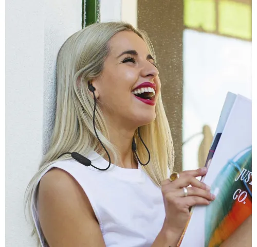 Навушники з'єднані проводом, який дозволяє просто повісити їх на шиї під час паузи, а магніти гарантують, що навушники не загубляться, випадково злетівши з шиї.