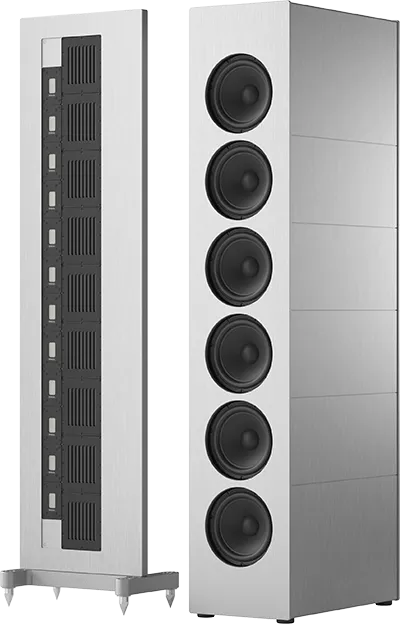 Підлогова акустика Piega Master Line Source. Оздоблення: сріблястий. Гриль: сріблястий чи чорний. Можливі варіанти спеціальної обробки. Пара.