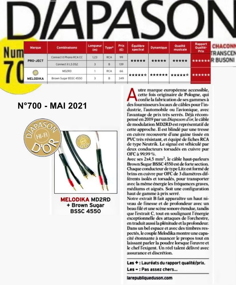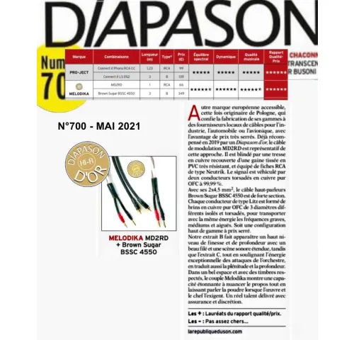 Melodika Purple MD2RD05 – це напрямний інтерконект 2xRCA – 2xRCA з серії Purple Black Edition, створений для якісної передачі стереоаналогового сигналу між компонентами аудіосистеми. Кабель побудований на основі двох скручених жил перерізом 0,35 мм², що забезпечує оптимальне співвідношення гнучкості