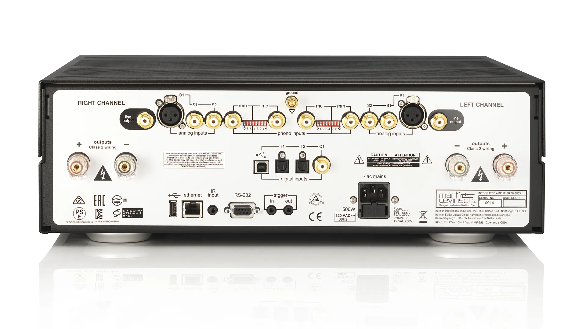 Вбудований фонокоректор No.5805 підтримує обидва типи головок звукознімача - MM і MC. Сумісність з картриджем по навантаженню регулюється за допомогою декількох перемикачів на задній панелі. Для кожного варіанта точно підібрані коефіцієнти звукопідсилення: контуру для MM-картриджа задано значення 39 дБ, а для MC - 69 дБ. Фірмова схема Pure Path від Mark Levinson забезпечує максимальну цілісність аудіосигналу з винятковою точністю і чистотою звуку.