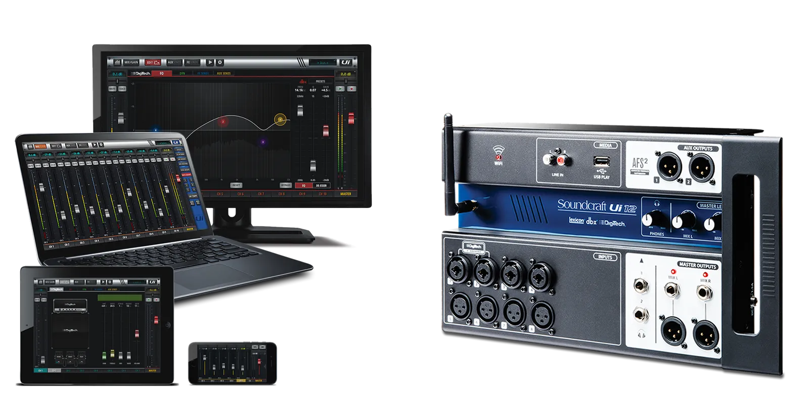 Микшеры серии Ui обладают кроссплатформенной совместимостью с устройствами iOS, Android, Windows, Mac OS и Linux и могут одновременно использовать до 10 устройств управления. Кроме того, Ui12 и Ui16 имеют встроенную обработку сигналов HARMAN от dbx, DigiTech и Lexicon, включая dbx AFS2, DigiTech Amp