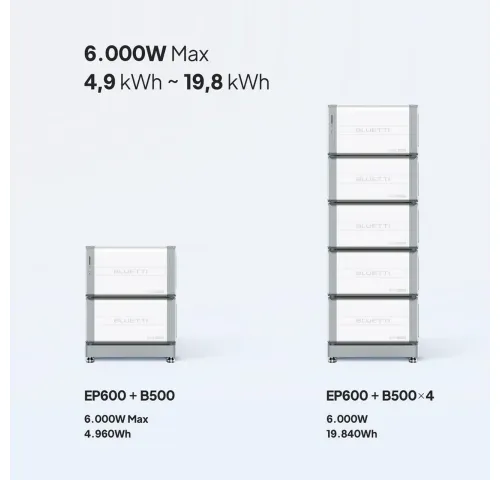 Новаторский модульный дизайн системы делает ее идеальной системой энергообеспечения, которая может адаптироваться к вашим потребностям. К одному инвертору EP600 можно подключить от 1 до 4 аккумуляторных блоков B500, что обеспечивает емкость от 4,9 до 19,8 кВт·ч соответственно. К двум инверторам можно подключит уже от 2 до 8 аккумуляторных блоков, что обеспечивает общую емкость системы от 9,9 кВт·ч до 39,6 кВт·ч.