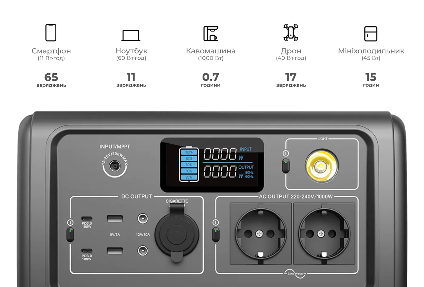 10 выходных портов наверняка удовлетворят ваши потребности в одновременной зарядке самых разных устройств. А 15-ваттная панель беспроводной зарядки на верхней стороне устройства значительно облегчит зарядку мобильного телефона. Электростанция обеспечит энергией всё — от мини-холодильников до светодиодных фонарей. Отличное компактное решение для кемпинга или каких-либо экстренных случаев!