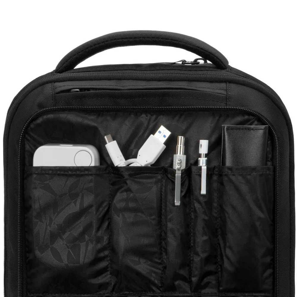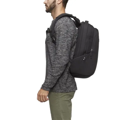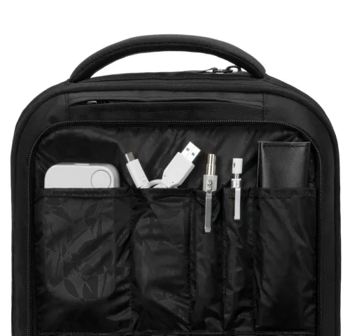 В основном отделении предусмотрено место для крупных предметов, а также для хранения документов и аксессуаров. Дополнительное отделение предлагает несколько карманов-органайзеров для хранения мелких предметов и специальный карман для iPad с боковым доступом. Отделение для ноутбука находится на задней панели рюкзака для обеспечения его наибольшей сохранности.