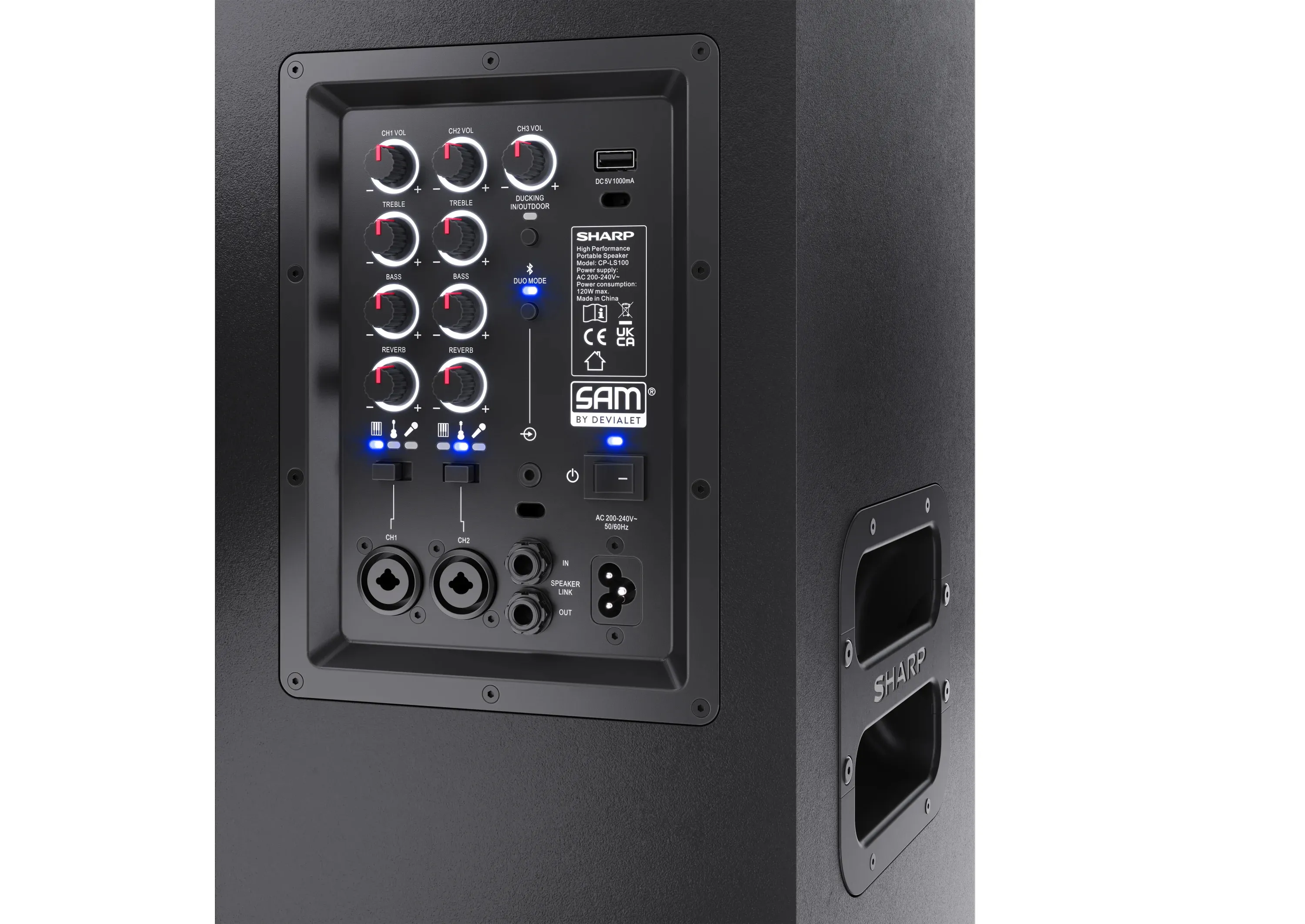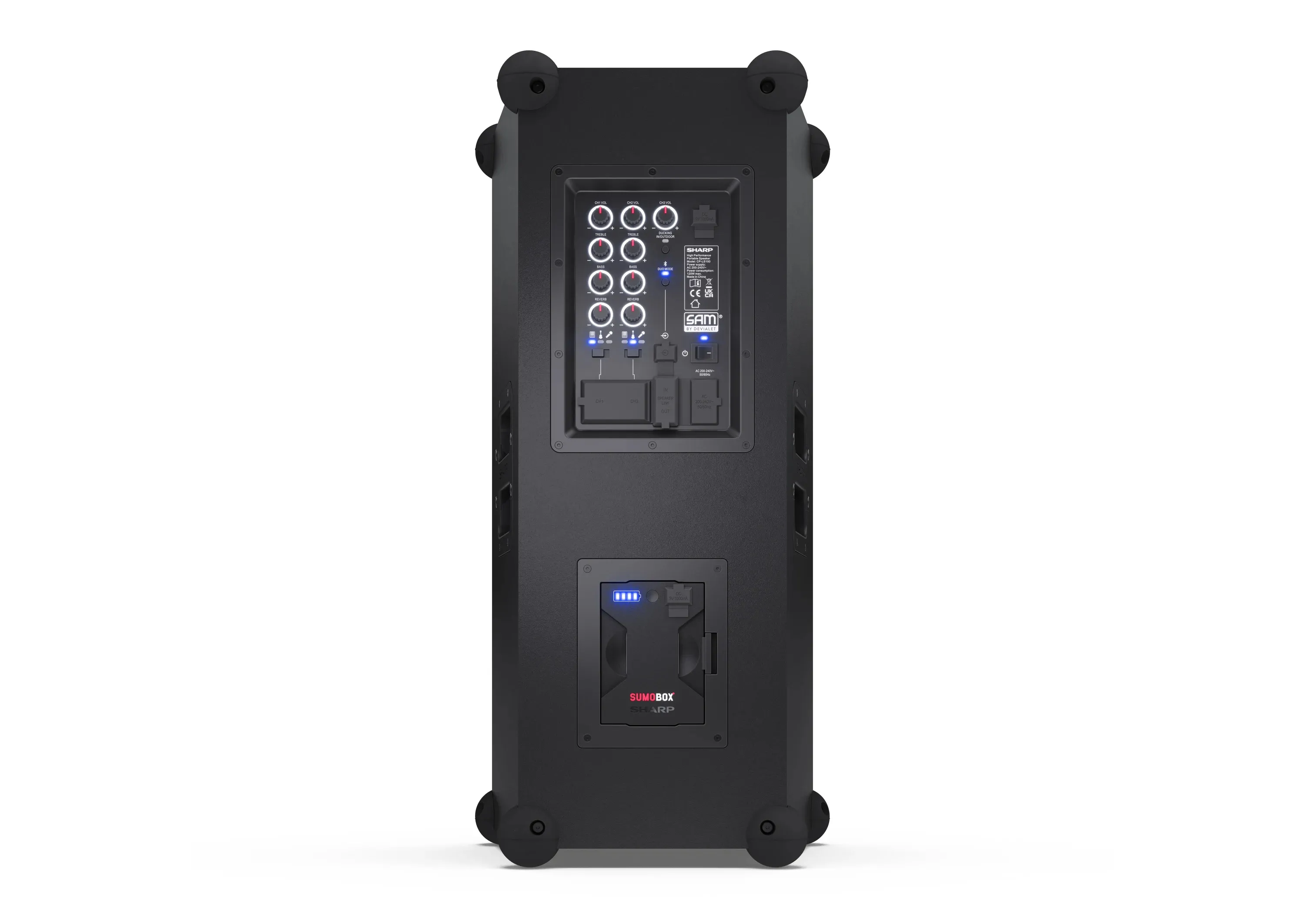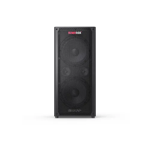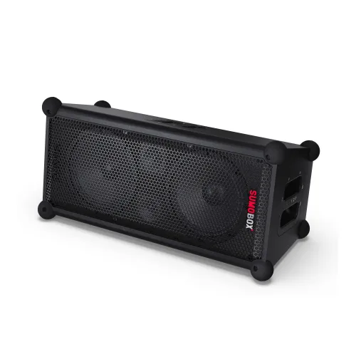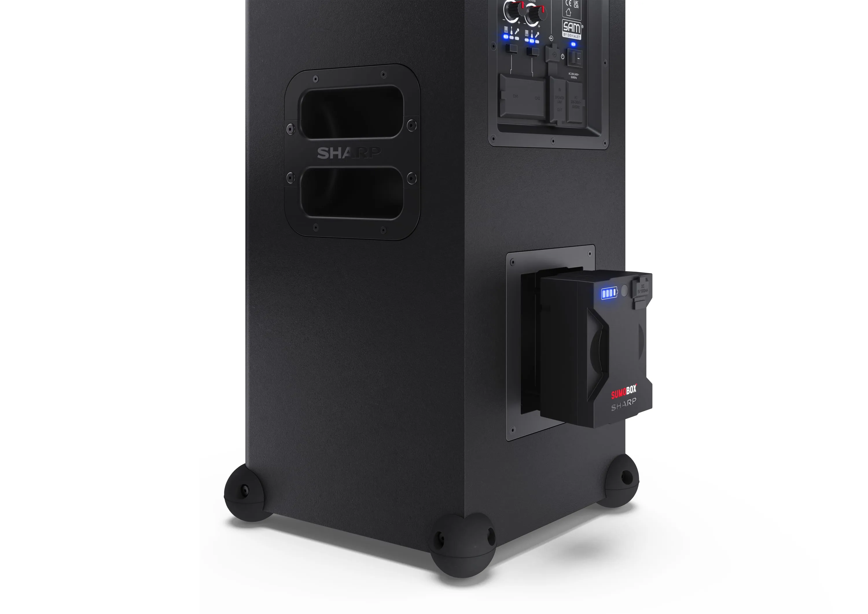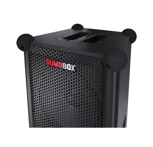 Sharp SumoBox представляет собой высокопроизводительную портативную акустическую систему модели CP-LS100, которая может обеспечить до 105 дБ чистого звукового удовольствия благодаря своим двум 8-дюймовым вуферам и двум 2-дюймовым высокочастотным динамикам, общая мощность которых составляет 120 Вт.Ак