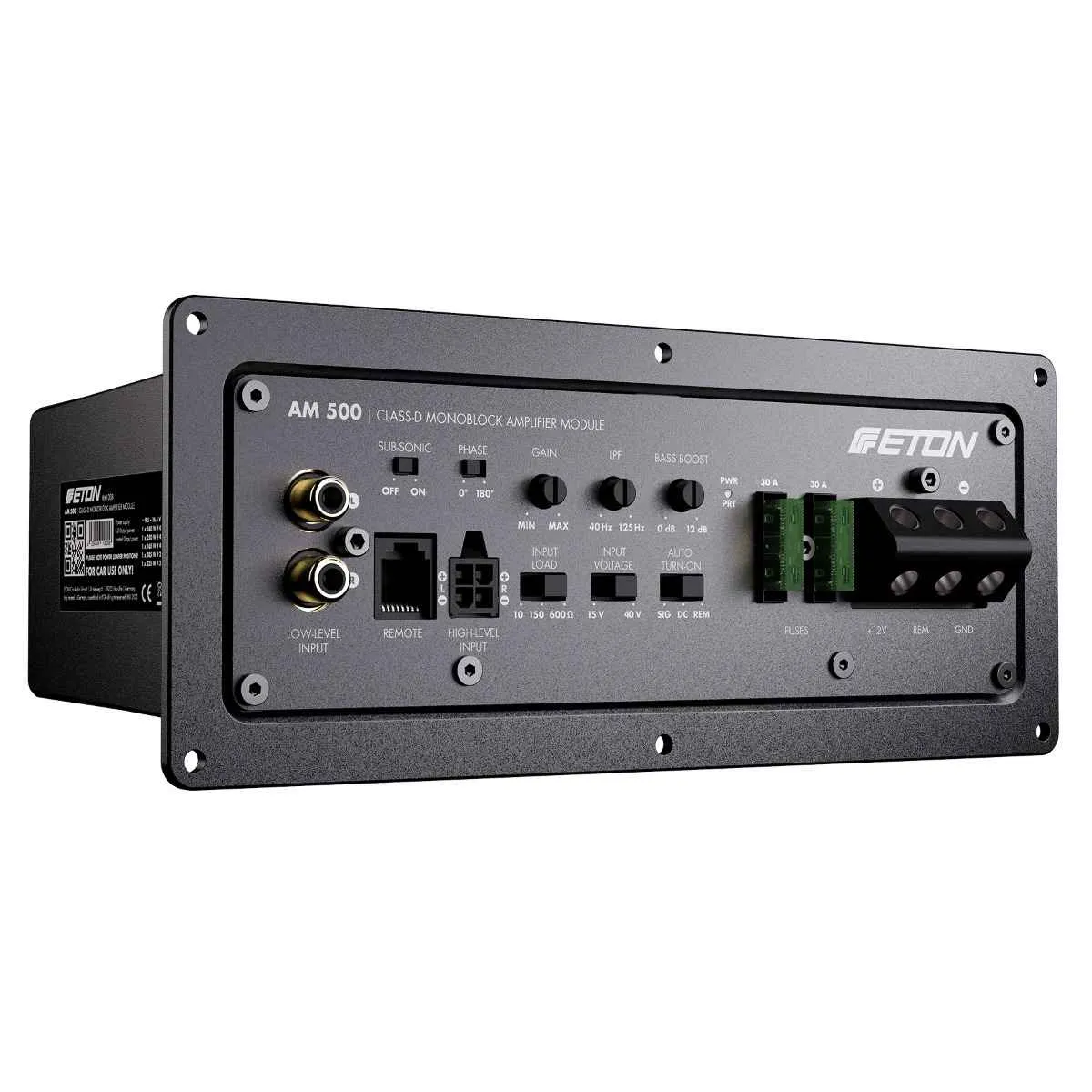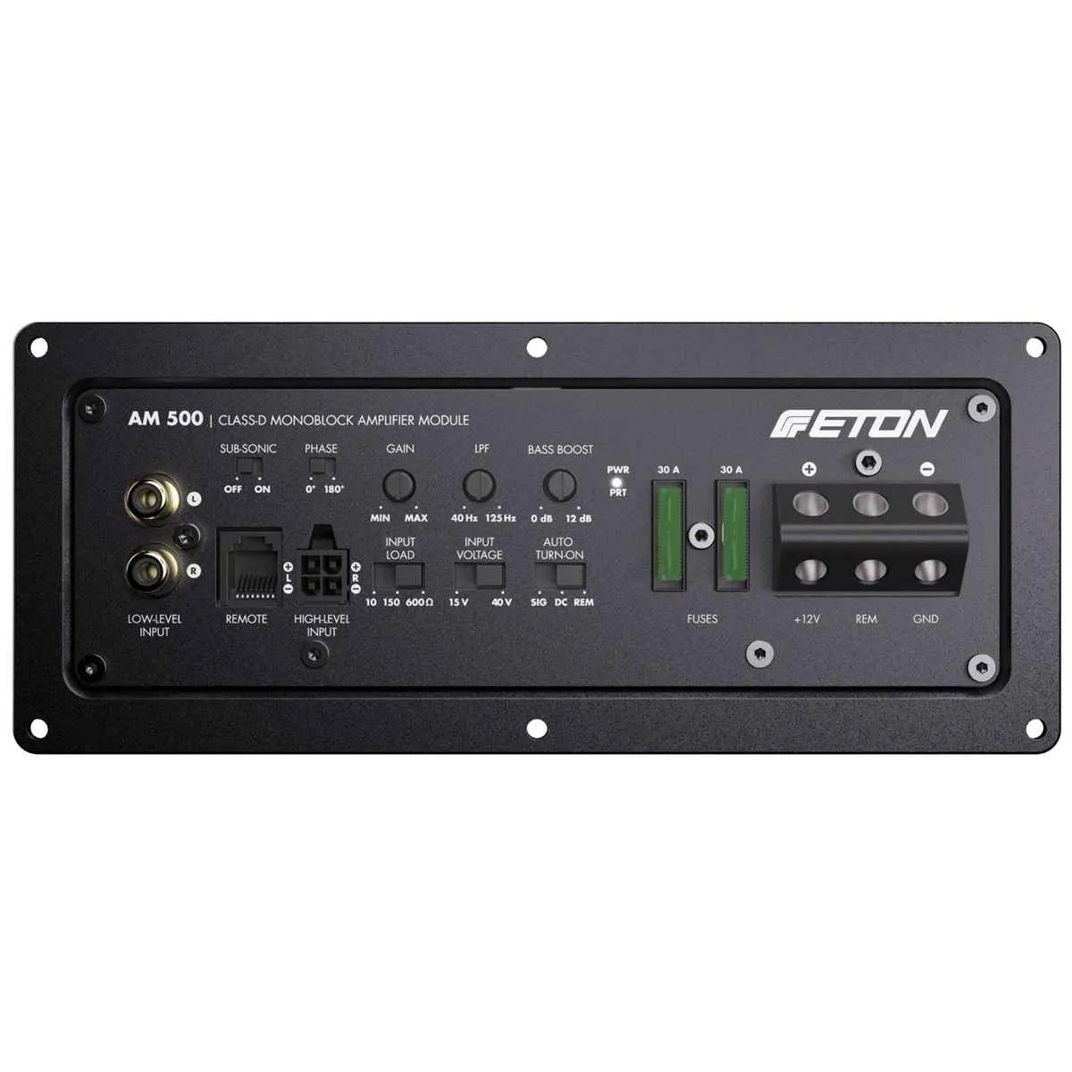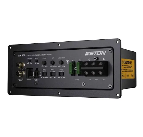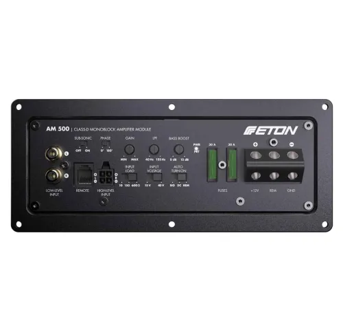 ETON AM500 — сверхмощный 1-канальный активный усилительный модуль класса D, созданный для интеграции непосредственно в корпус сабвуфера. Герметичный литой алюминиевый корпус с ребрами охлаждения обеспечивает высокую термостабильность и надежность даже при длительных нагрузках, а продуманные габариты