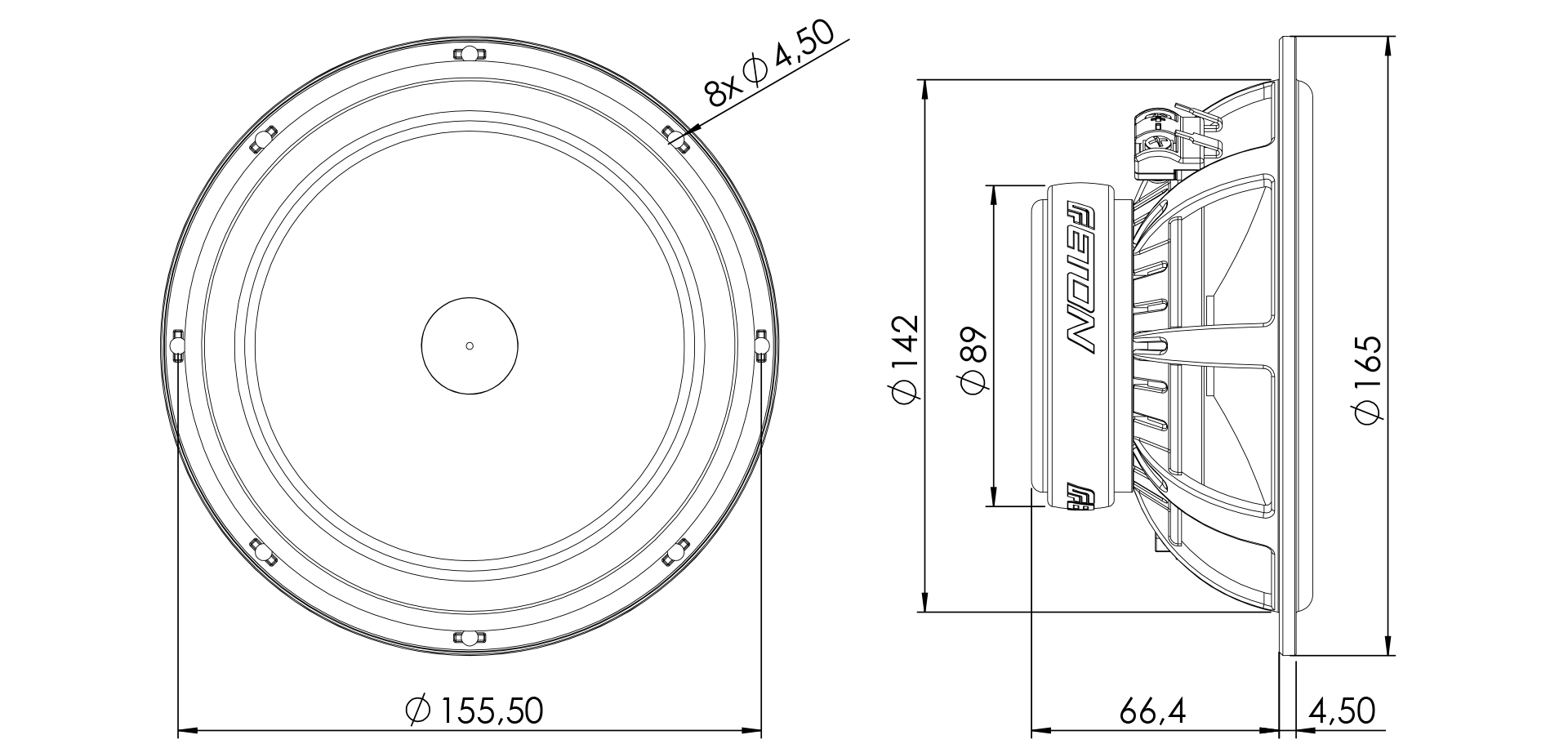ХарактеристикиТвиттер: 28 мм (1 1/8")Бас/среднечастотный динамик: 165 мм (6,5")Импеданс: 4 ΩНоминальная мощность (RMS): 70 Вт.Музыкальная мощность: 100 ВтУровень звукового давления: 90 дБНаружный диаметр: 165 ммГлубина установки: 66,4 ммНоминальный импеданс: 4 ΩОбщая подвижная масса (включая массу воздуха): 11,7 гПостоянное сопротивление: 3,2 ΩЭффективная площадь поршня: 137 см²Индуктивность катушки: 0,34 мГнРезонансная частота TSP: 72 ГцКоэффициент силы: 4,8 ТмУпругость подвески: 0,41 мм/НМеханический добротный коэффициент: 3,55Xmax механический: +/- 9,0 ммЭлектрический добротный коэффициент: 0,68Эквивалентный объем воздуха подвески: 11 дм³Общий добротный коэффициент: 0,57Характеристический уровень звукового давления 1 Вт/1 м: 90 дБМеханическое сопротивление: 1,62 кг/сРейтинговая мощность: 70/100 ВтМатериал магнита: ФерритДиаметр катушки: 25 мм