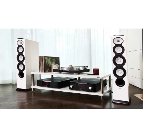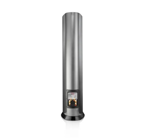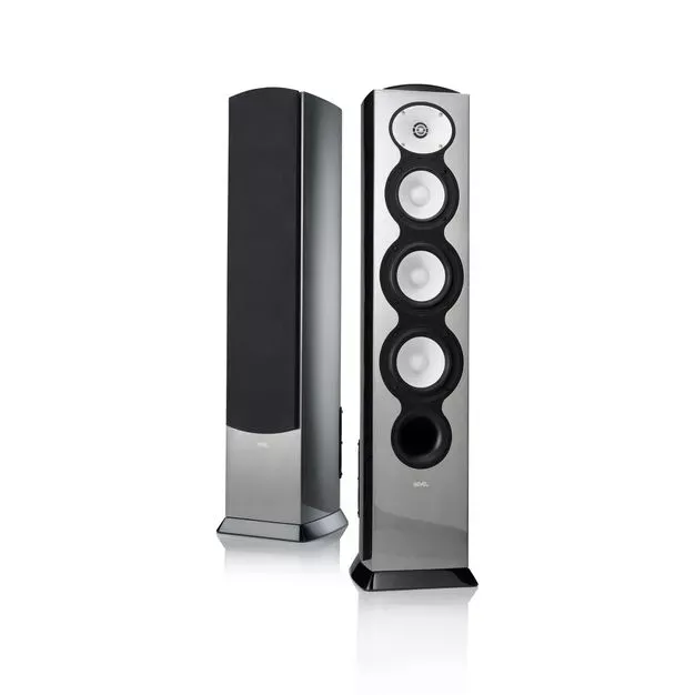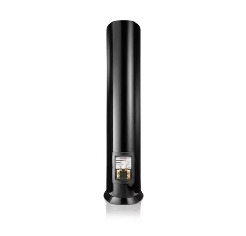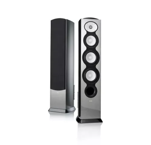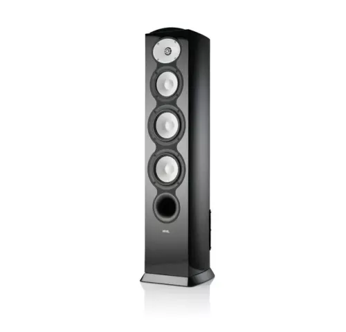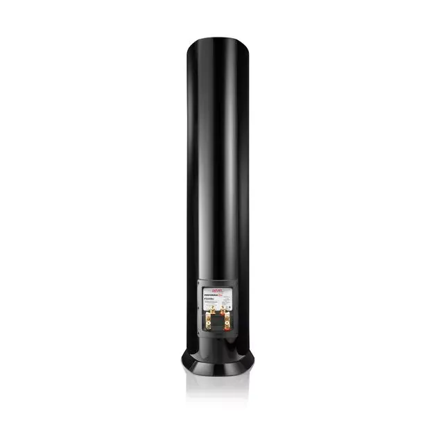 Верхние панели F328Be выкрашены в стильный черный металлик с выпуклыми эмблемами гальванопластики. Колонки доступны в четырех вариантах глянцевой отделки для идеальной интеграции в любой интерьер: черный, белый, орех и серебристый металлик.