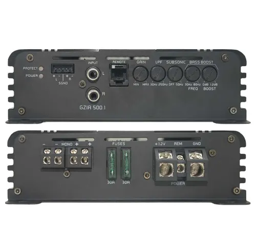 Ground Zero GZIA 500.1 — 1-канальный автомобильный усилитель класса D, предназначенный для работы с сабвуфером в автомобильной аудиосистеме. Модель подходит для систем автозвука, где требуется мощное и точное усиление низких частот