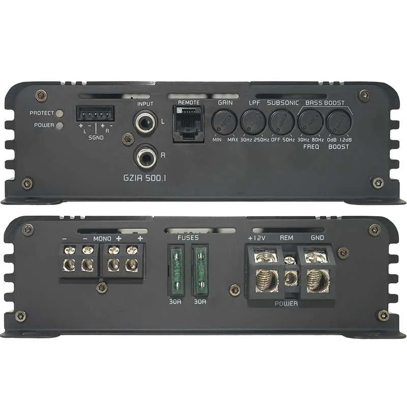 Усилитель стабильно работает с нагрузкой 1 Ом, оснащен встроенным активным кроссовером, регулируемым subsonic-фильтром и Bass Boost. Вход высокого уровня с Auto-On и dummy load упрощает подключение к штатным головным устройствам, поэтому GZIA 500.1 можно использовать для апгрейда штатной аудиосистемы без обязательного наличия RCA-выходов.