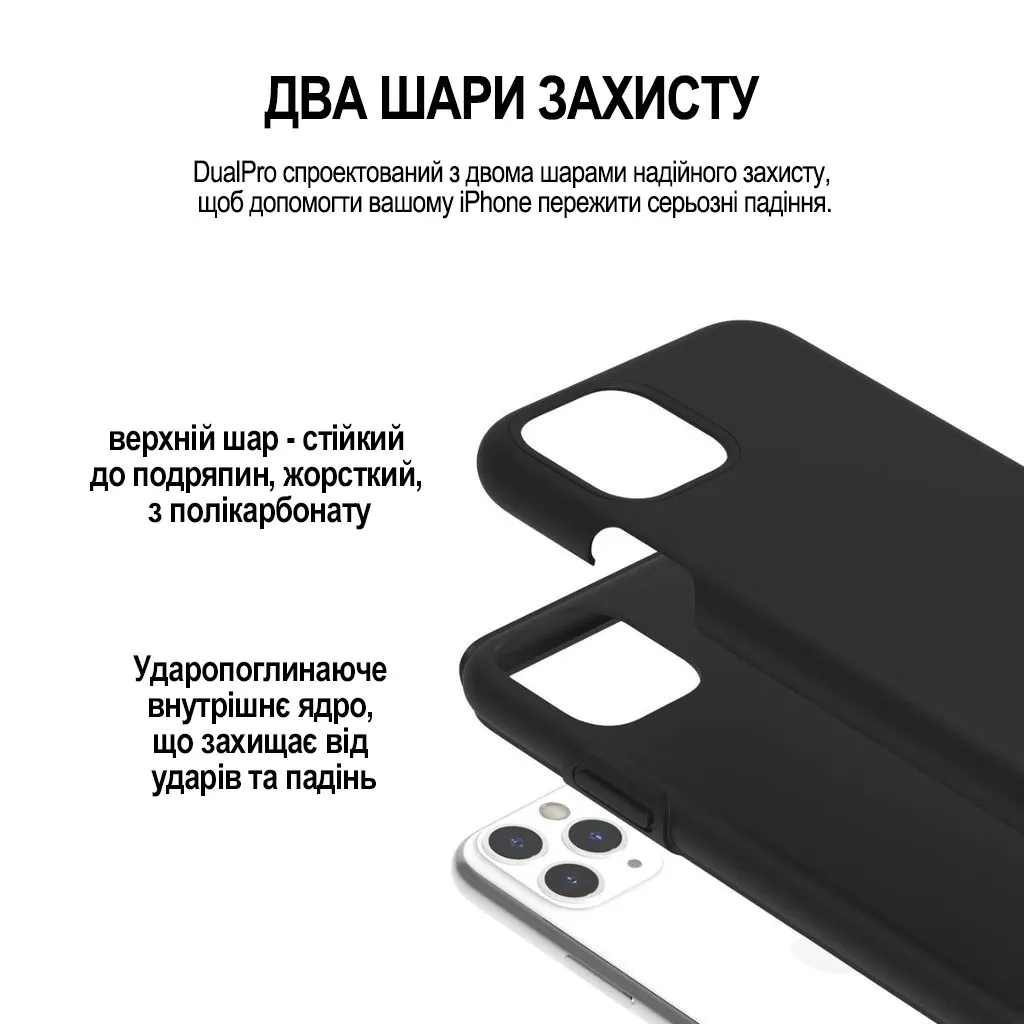 · 2 слой : амортизирующее внутреннее ядро защищает от ударов и падений.DualPro поможет вашему iPhone 11 Pro выдержать падение с высоты до 10 футов (3 метра), обеспечивая при этом полный доступ к портам и кнопкам.