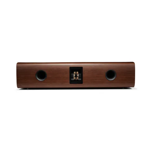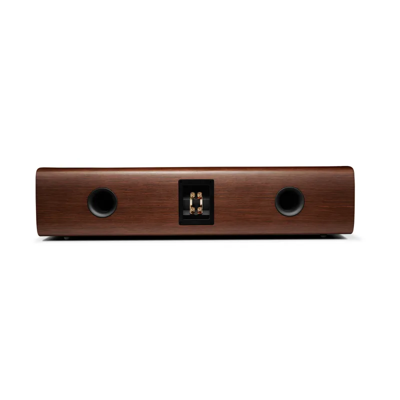 Изысканный изогнутый корпус отличается современным дизайном и отделкой может быть окрашен в черный глянцевый автомобильный цвет или отделан шпоном из орехового дерева или серого дуба. Черная ткань решетки на магнитах завершает элегантный вид.