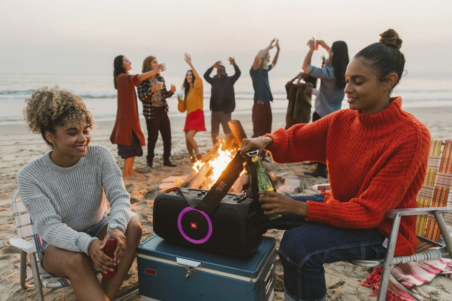 100 Вт мощного звука JBL Pro Sound, синхронизированного с пульсирующим световым шоу. Также доступно беспроводное соединение двух колонок, чтобы получить мощный стереозвук для вечеринки.