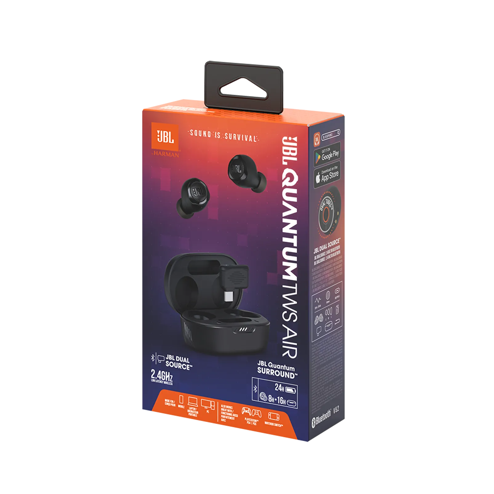 ОписаниеРазумная технология AmbientСледите за звуками окружающего мира с Ambient Aware во время игры в дороге, общайтесь с товарищами по команде или семье, не снимая наушники.Беспроводное соединение с низкой задержкойУстановите соединение с низкой задержкой 2,4 ГГц с совместимыми устройствами с помощью дополнительного USB-C-адаптера, надежно удерживаемого в корпусе зарядного устройства. Наушники JBL Quantum TWS Air совместимы со всеми устройствами с поддержкой Bluetooth, такими как смартфоны и планшеты или Nintendo SwitchTM.JBL Dual Source и Fast PairНе пропустите звонок при защите галактики. После подключения через беспроводную связь 2,4 ГГц без потерь к совместимому устройству, вы легко можете принять входящий вызов через Bluetooth, а затем вернуться к беспроводной связи 2,4 ГГц без потерь с JBL Dual SourceTM. А из Fast Pair Quantum TWS Air подключаются к вашему устройству сразу же, как вы их вынимаете из корпуса.Кристально чистое общение в играх благодаря 4 микрофонам с формированием лучейВы выполняете команды или вызываете друзей на игру, ваш голос всегда будет слышен и ясным благодаря технологии двух микрофонов с формированием лучей с обеих сторон.Разработано для игр на каждый деньИграйте, если хотите, день или ночь, на солнце или в дождь, с автономностью батареи до 8 часов и 16 в корпусе, а также с водостойким дизайном IPX4. Овальные трубки на наушниках идеально подходят для ваших ушей, обеспечивая комфорт на длительное время в пути.JBL QuantumSURROUNDЧувствуйте себя словно внутри игры с JBL QuantumSURROUND*, который работает на драйверах 6,8 мм, для погружного и точного звучания вокруг вас.Совместимость с JBL QuantumENGINE & JBL Headphones AppПолный контроль над стереозвуком True Wireless в любом месте. Наушники JBL Quantum TWS Air совместимы с собственным программным обеспечением JBL Quantum для ПК и приложением JBL Headphones App, позволяющим настраивать ваши параметры эквалайзера, микрофона и объемного звука для идеальной игровой среды.