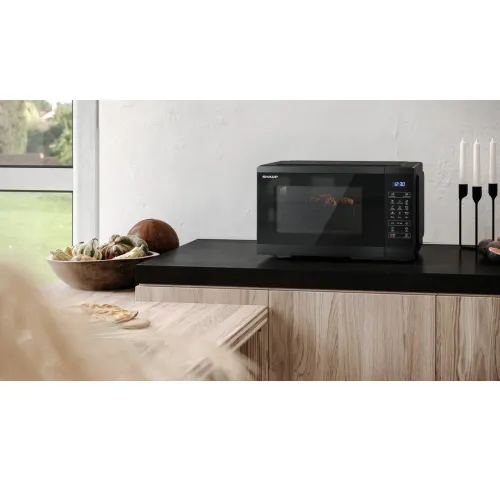 ОписаниеМикроволновая печь 25 л с режимом гриля и полностью цифровым управлениемОсновные моменты• Емкость: 25 литров• Мощность в режиме микроволновой обработки: 900 Вт• Мощность в режиме гриля: 1000 Вт• Уровни мощности микроволн: 11• Тип управления: полностью цифровой• 8 автоматических программ, включая размораживание по времени и по весу• Тип камеры: Поворотный стол• Освещение камеры: да• Простота очистки• Блокировка от детей• Функция ECO• Цвет корпуса: черный• Цвет дверцы: черный• Принадлежности в комплекте: поворотный стол и решетка для гриляГрильЗапечь запеканку с сыром, поджарить хлеб, подрумянить блюдо до хрустящей корочки блюда — функция гриля придаст вашему быстрому приготовлению еще больше удовольствия и разнообразия. В микроволновой печи Sharp вы можете даже идеально приготовить колбаски, стейки и курицу — ведь теперь у вас есть настоящий электрический гриль, который к тому же не нужно покупать отдельно.Микроволновая печьБудь то разморозка, разогрев или приготовление пищи — волшебным словом для быстрого и простого приготовления пищи является микроволновая печь. В основе ее работы — высокочастотные электромагнитные волны, что экономит не только время, но и энергию по сравнению с духовкой. И кроме того ваша микроволновка Sharp занимает мало места, компактна и проста в обращении, что делает его идеальным для ежедневного использования.