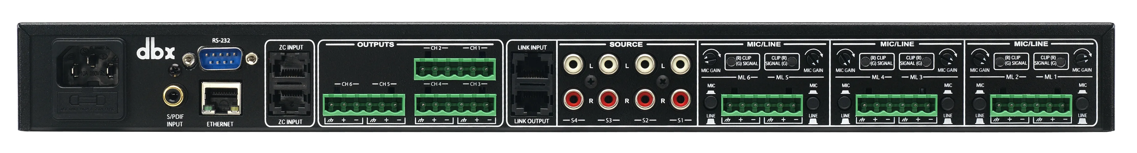 ОписаниеМногофункциональный зонный аудиопроцессор dbx 1261m легендарной серии ZonePRO, объединяющий в себе несколько блоков, отвечающих за цифровую систему управления акустическими системами, подавление обратной связи, кроссовер, лимитеры, эквалайзеры и прочее. Бренд dbx давно ассоциируется у звукорежиссеров и любителей с надежной профессиональной аппаратурой, проверенной временем. В результате каждый клиент, покупая данный контроллер, получает отличную производительность, низкий уровень шума и повышенную надежность.Встроенные кроссоверы производят частотное разделение и подаёт сигнал на громкоговорители с помощью шести звуковых выходов. В процессоре использованы прецизионные фильтры и лучшая электронно-компонентная база для лучшего воспроизведения выходного сигнала, устраняя искажения и придавая более чистый и четкий звук. Микшерная матрица реализована на 10 аналоговых входах и 6 аналоговых выходах с разъемами RCA и Euroblock; 6 входа Euroblock являются комбинированными балансными, к которым могут подключаться как микрофоны, так и другие линейные источники. Для подключения к 2-м цифровым аудиоканалам имеется вход S/PDIF, расположенный также сзади. Микрофонные входы поддерживают индивидуальное изменение усиления и фантомное питание напряжением 15 В. Функция АРУ поддерживает уровень сигнала на постоянном уровне. Индивидуальные мгновенные лимитеры на каждый выходной канал для оптимальной защиты акустики. LINK IN/LINK OUT служат для расширения зон первых 6 аудиоканалов при линковании с другими процессорами серии ZonePRO. Легко настраиваемый параметрический эквалайзер (EQ). Функция коррекции времени задержки входных/выходных сигналов в автоматическом режиме. В системе реализован генератор Pink Noise. Дистанционное управление осуществляется через кабель типа "витая пара" CAT.5, со стандартным разъемом RJ45 и подключен к Ethernet-интерфейсу. Доступно управление с мобильных устройств на платформах Windows/Apple/Android. Подключение зонных контроллеров линейки ZC обеспечивается через отдельные 2 входа. Полное управление через специализированное ПО ZonePRO Designer на ПК посредством подключения к интерфейсу RS-232, расположенному на задней панели. Удобное цифровое меню и информационный дисплей упрощают процесс настройки и другие манипуляции. В данной модификации реализован компенсатор окружающего шума ANC.