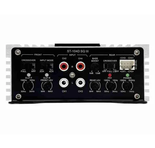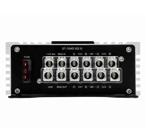 ОписZpco ST-104D SQ III – компактний 4-канальний підсилювач класу D з бездоганною якістю звукуZpco ST-104D SQ III – це високопродуктивний 4-канальний підсилювач класу D, який поєднує виняткову якість звучання, високу потужність і компактні габарити. Завдяки сучасним технологіям та використанню високоякісних компонентів, цей підсилювач забезпечує чисте, деталізоване звучання навіть у складних акустичних умовах.Компактний дизайн дозволяє легко інтегрувати Zpco ST-104D SQ III у будь-яку аудіосистему, навіть за обмеженого простору. Удосконалений алюмінієвий корпус із ребристою структурою сприяє ефективному розсіюванню тепла, що забезпечує стабільну роботу пристрою при тривалих навантаженнях.Цей підсилювач пропонує широкі можливості налаштувань, включаючи регульований електронний кросовер, контроль посилення басів та гнучку систему підключень через RCA або високорівневі входи. Завдяки вихідній потужності до 300 Вт у мостовому режимі, він підходить для живлення як компонентної акустики, так і сабвуферів, що робить його універсальним рішенням для будь-якого звукового проєкту.Особливості:
